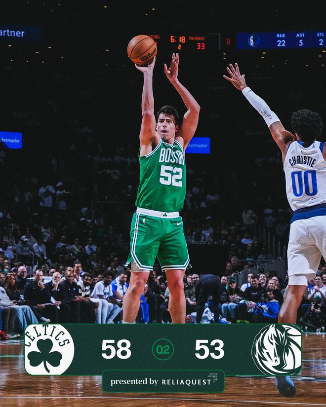 第二節(jié)開始后兩隊(duì)拉鋸幾個(gè)回合,馬丁和馬紹爾輪流得分,獨(dú)行俠隊(duì)以29-26領(lǐng)先。懷特連拿5分幫助球隊(duì)再次反超,獨(dú)行俠隊(duì)不甘示弱,華盛頓三分命中結(jié)束9-2的小高潮,半場前5分40秒時(shí)他們以38-34領(lǐng)先。普理查德三分追近,弗拉格、馬紹爾先后取分,獨(dú)行俠隊(duì)繼續(xù)保持領(lǐng)先。布朗連拿3分把差距縮小到1分,華盛頓失誤,普理查德三分不中,守在籃下的塔圖姆直接把球補(bǔ)扣,他拿到復(fù)出后的前2分。弗拉格單打回應(yīng),塔圖姆找回手感底角三分命中,懷特隨后突破扣籃打3分,凱爾特人隊(duì)以58-53反超5分進(jìn)入半場休息。