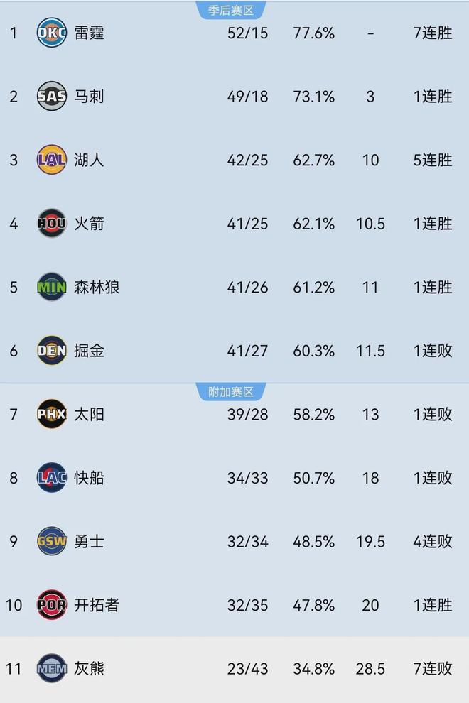 快船當(dāng)前戰(zhàn)績(jī)?yōu)?4勝33負(fù)排名西部第八,落后第六的掘金6.5個(gè)勝場(chǎng),領(lǐng)先第11的灰熊10.5個(gè)勝場(chǎng),盡管很難直通季后賽,可基本鎖定了一個(gè)附加賽名額,無(wú)論倫納德情況如何剩余賽程重中之重都乃守住該位置防止勇士開(kāi)拓者反超。