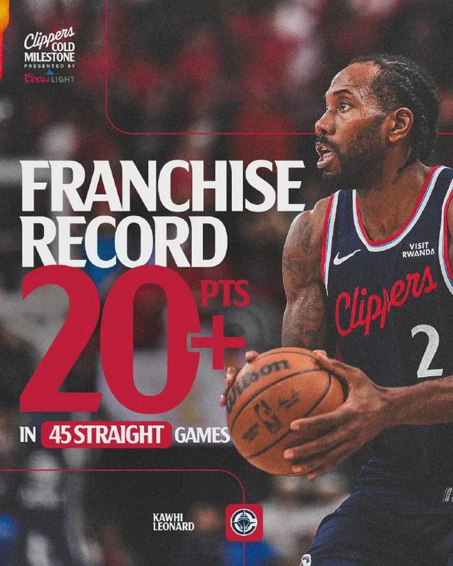 倫納德盡管只打了不到26分鐘,可出手23次中13球砍下31分6板2斷,已經(jīng)連續(xù)45場(chǎng)比賽得分20+創(chuàng)造快船隊(duì)史最長(zhǎng)紀(jì)錄,之前該紀(jì)錄保持者為1972年榜眼秀鮑勃-麥卡杜。