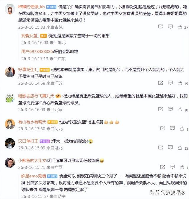 隨后,媒體人“我愛女籃”發(fā)文點(diǎn)評(píng):總要有人說,總要有人做,楊力維這番言論無疑是有風(fēng)險(xiǎn)的,因?yàn)榭赡軙?huì)動(dòng)一些人的蛋糕。但我愛女籃認(rèn)為,楊力維這是真正希望中國女籃越來越好才仗義執(zhí)言??v觀全球體壇,職業(yè)化程度較高的足球和籃球,運(yùn)動(dòng)員都是在高水平的俱樂部比賽和提高,歐冠和NBA(WNBA)的商業(yè)價(jià)值早就超越大部分國家隊(duì)比賽。每逢國際比賽日,球員再從俱樂部征召到國家隊(duì),但最長集訓(xùn)時(shí)間不超過兩周,而我們總是與國際潮流背道而馳。