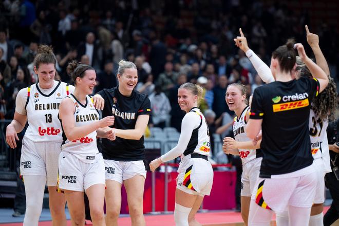 ↑3月12日,比利時隊球員賽后慶祝勝利。當(dāng)日,在武漢舉行的2026年女籃世界杯資格賽A組比賽中,中國隊65:80不敵比利時隊。新華社記者 伍志尊 攝