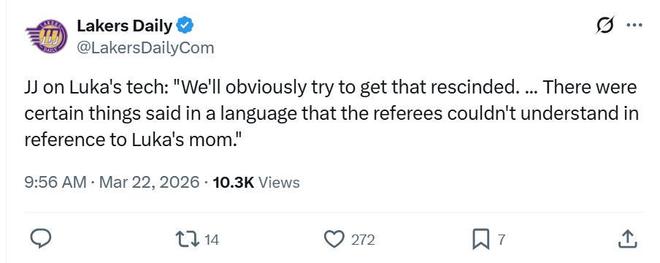 賽后湖人主帥雷迪克也給出相同說法,表示是對手比塔澤用裁判聽不懂的話(塞爾維亞語)說了一些關(guān)于東契奇媽媽的話,球隊肯定會想辦法努力撤銷這一次吹罰。