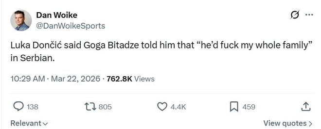 賽后采訪中東契奇再次確認這一說法:“他用塞爾維亞語朝我說我C你全家(he’d fuck my whole family),我真得忍受不了了?!?/p>