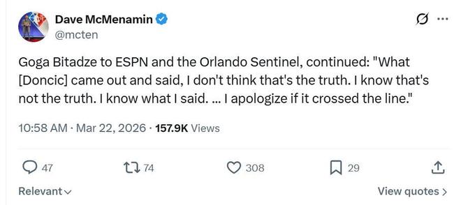 面對湖人與東契奇的這番說法,作為事件另一位主人公的比塔澤公開表示東契奇在說謊,是后者先辱罵了自己的家人,自己只是用同樣的話回擊。