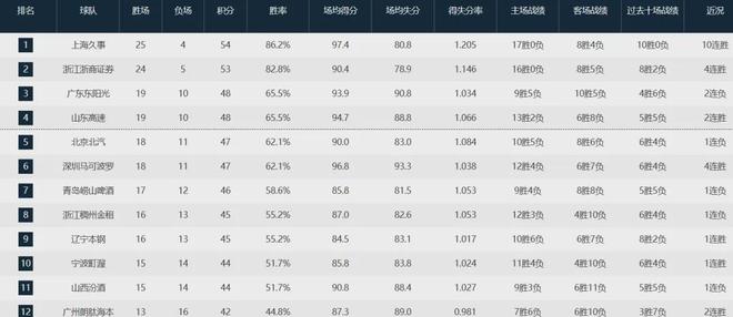 目前上海隊(duì)以25勝4負(fù)高居聯(lián)盟榜首,廣東隊(duì)19勝10負(fù)位列第三,北京隊(duì)18勝11負(fù)第五,吉林隊(duì)12勝17負(fù)排名第15位。