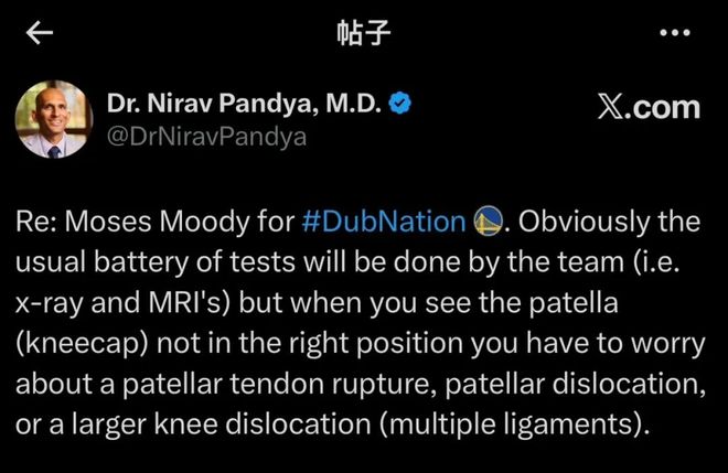 我問(wèn)了下AI,膝蓋出現(xiàn)了明顯凹陷、骨頭突出的畸形,這是關(guān)節(jié)脫位的典型外觀。這種情況常伴隨內(nèi)側(cè)支持帶撕裂、軟骨損傷,嚴(yán)重時(shí)會(huì)合并血管神經(jīng)損傷(這直接威脅職業(yè)生涯)。