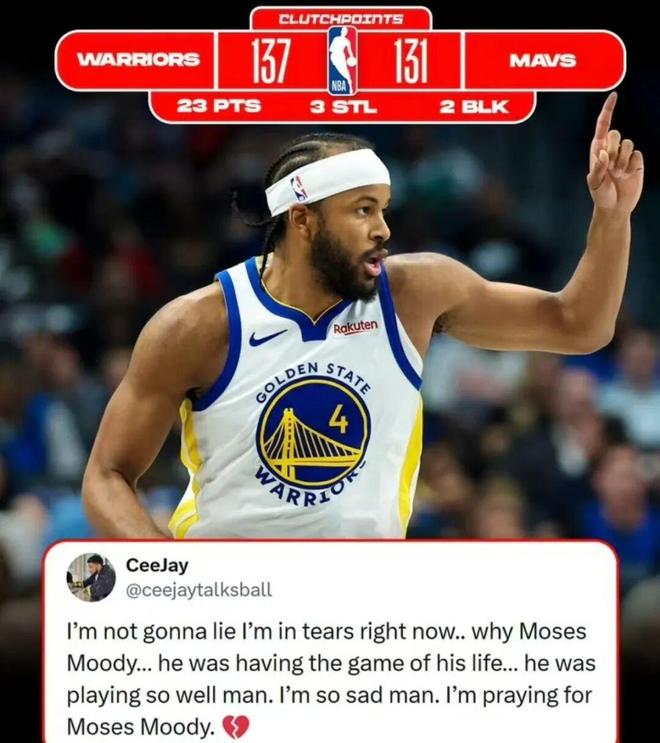 我跟你說(shuō),勇士獨(dú)行俠這球看完,心里堵得慌。加時(shí)最后一分鐘,穆迪搶斷弗拉格,一條龍殺向空籃,這本該是鎖定勝局的一球,是他復(fù)出首戰(zhàn)最完美的收尾,可就在起跳那一下,無(wú)對(duì)抗,膝蓋直接折了。