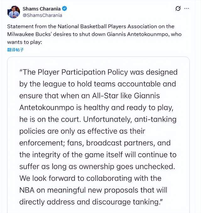 球員工會在周三的聲明中援引了NBA的反擺爛條例,并明確表示字母哥身體健康、具備出戰(zhàn)條件。