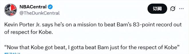 北京時(shí)間3月26日,雄鹿球員小凱文-波特在近期的一次直播中表示,自己總有一天要打破阿德巴約的83分紀(jì)錄,以此來(lái)致敬科比。