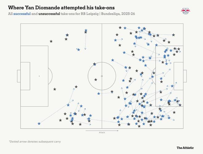 這位科特迪瓦國腳去年夏天才從萊加內(nèi)斯轉(zhuǎn)會至RB萊比錫,但已引起廣泛關注。如上圖所示,迪奧曼德非常喜歡盤帶……非常頻繁。在歐洲頂級聯(lián)賽所有球員中,只有維克托-穆尼奧斯(奧薩蘇納)、維尼修斯(皇家馬德里)和亞馬爾(巴塞羅那)的過人次數(shù)比他更多——如下圖所示,他能在兩條邊路都完成突破。