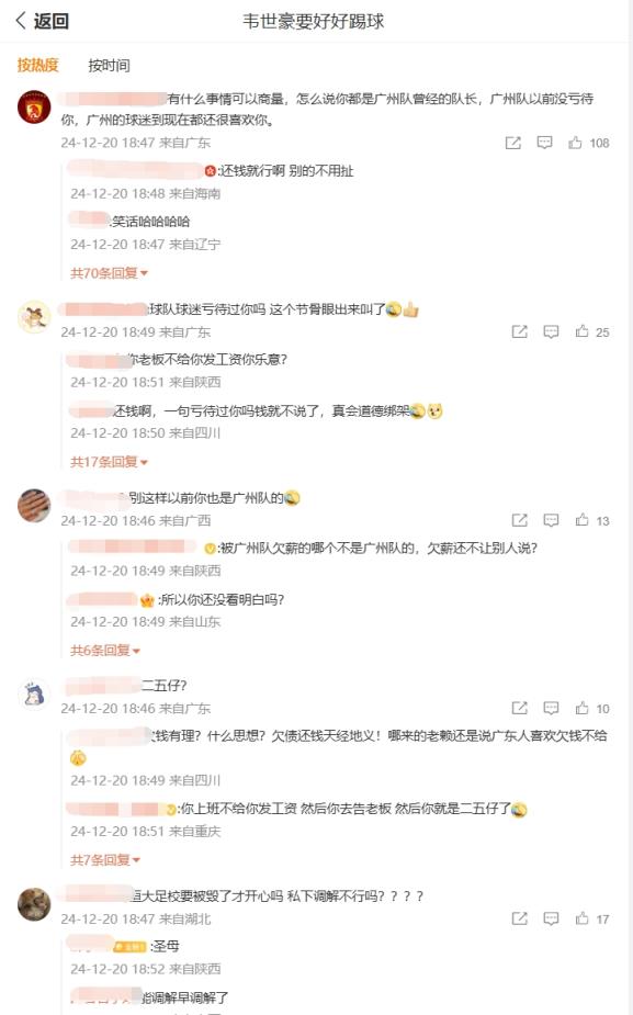 在韋世豪的微博評論區(qū)下充斥著兩種聲音,一種認為韋世豪當初也是廣州隊隊長,有什么事可以商量,另一種則認為俱樂部欠債還錢天經(jīng)地義。你怎么看?